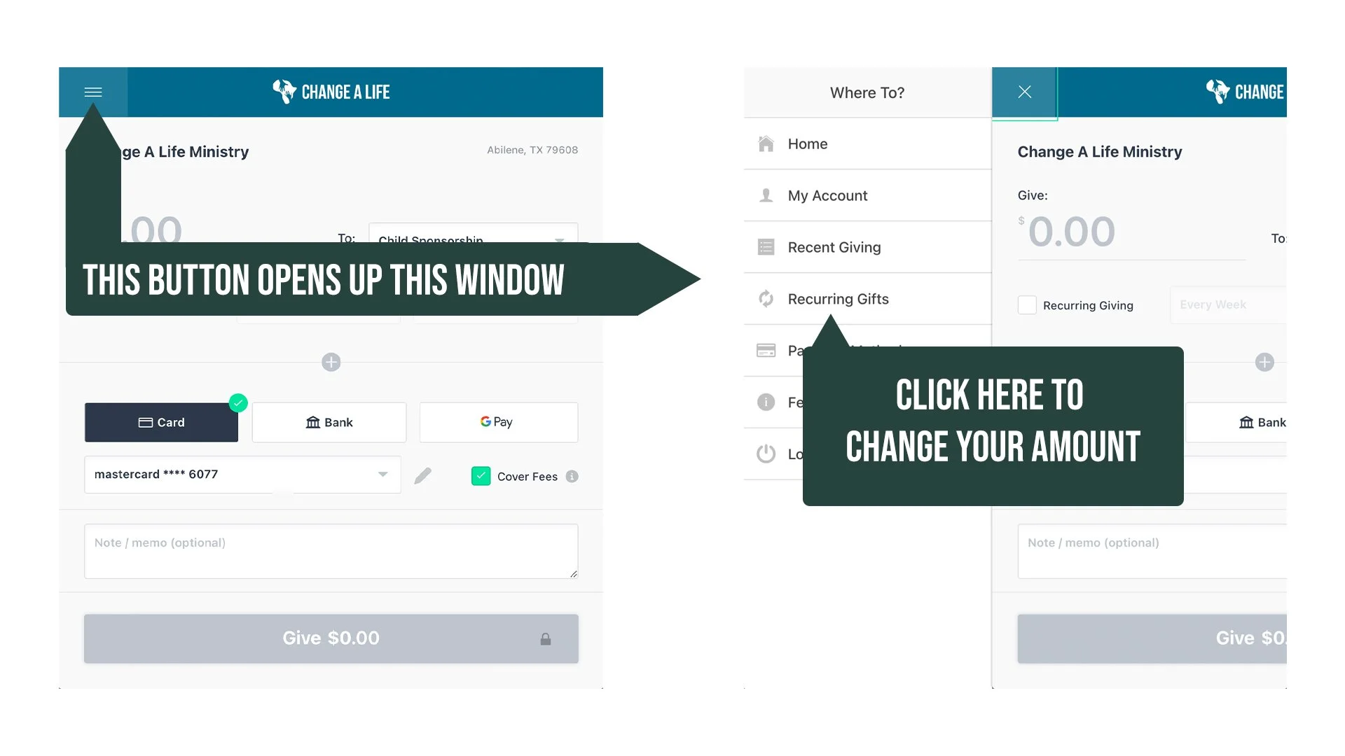 Thank you for giving to Change A Life! This ministry would not exist without the faithful generosity of people like you. If you are interested in changing anything about your giving — including amount, frequency, or payment method — follow these instructions: